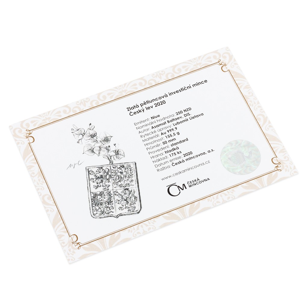 V roce 2020 dostaly všechny varianty investičních mincí České mincovny nový kabátek, ale hlavní myšlenka zůstala zachována. Vedle českého lva v netradičně realistickém podání předkládá reverzní strana zlaté mince ještě další dva symboly české státnosti – Svatováclavskou korunu, která spočívá na hlavě dvouocasé šelmy, a orlici na štítu, která je syntézou svatováclavského, moravského a slezského dravce. Autorem reliéfu je medailér Asamat Baltaev, DiS. Averzní strana nese atributy ostrova Niue, který České mincovně poskytuje zahraniční licenci k ražbě vlastních mincí – tj. portrét a jméno královny Alžběty II., rok emise 2020 a nominální hodnotu 250 DOLLARS (NZD). To vše je doplněno ještě lipovými ratolestmi.