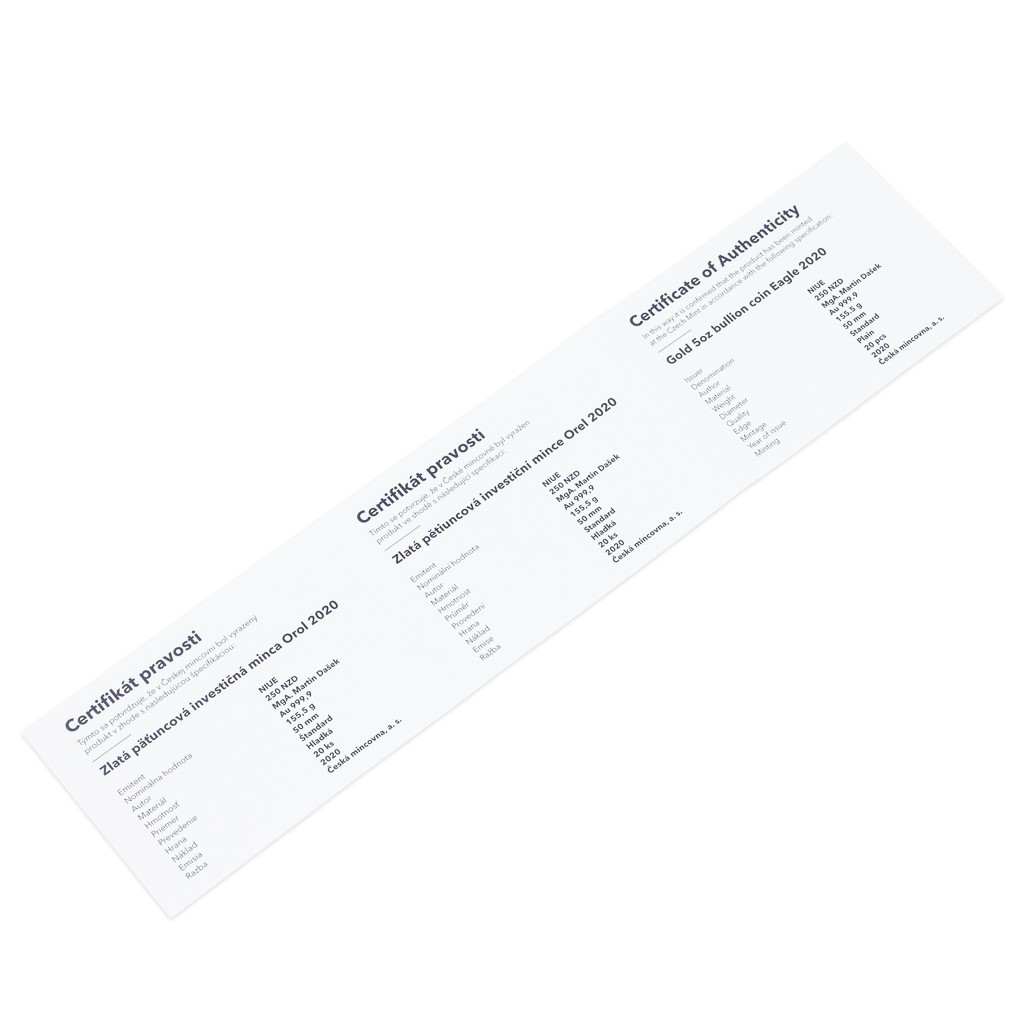 Zlatá pětiuncová investiční mince Orel 2020 stand