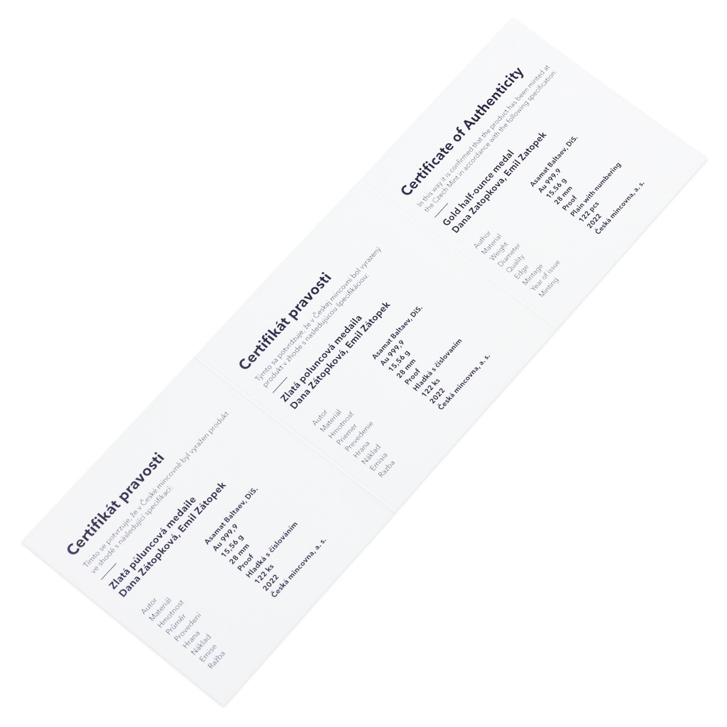 Zlatá půluncová medaile Dana Zátopková, Emil Zátopek proof