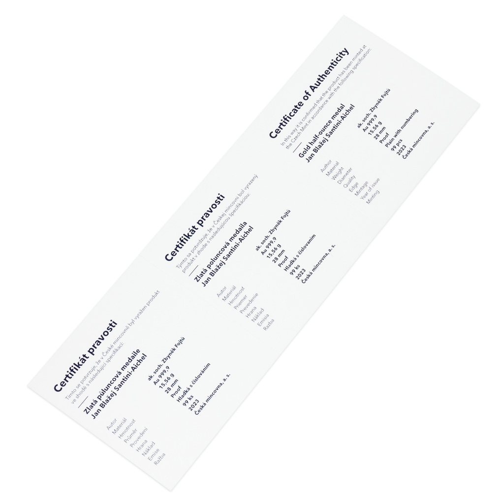 V roce 2023 si připomínáme 300. výročí úmrtí architekta Jana Blažeje Santini-Aichela. Při této příležitosti vznikla půluncová zlatá medaile České mincovny, která je součástí volného cyklu nejkrásnějších nerealizovaných návrhů přihlášených do soutěží České národní banky.