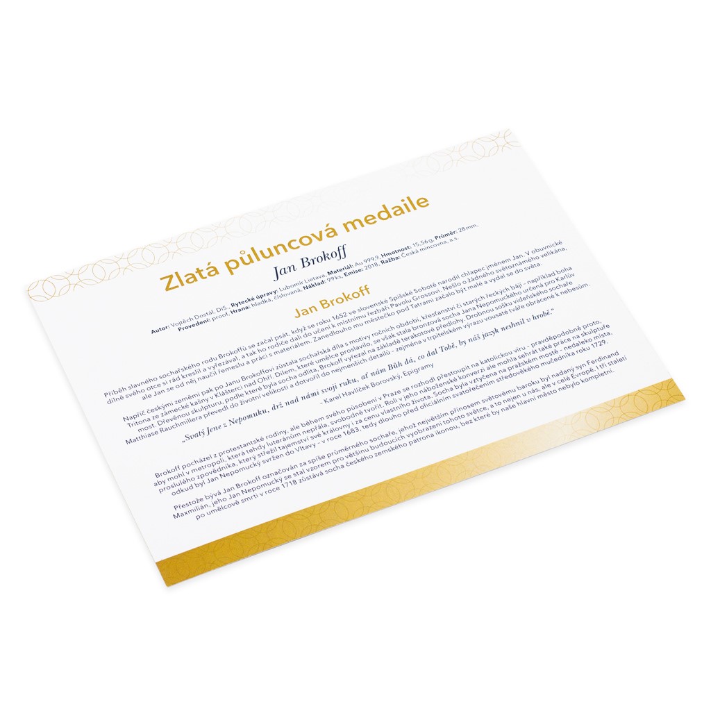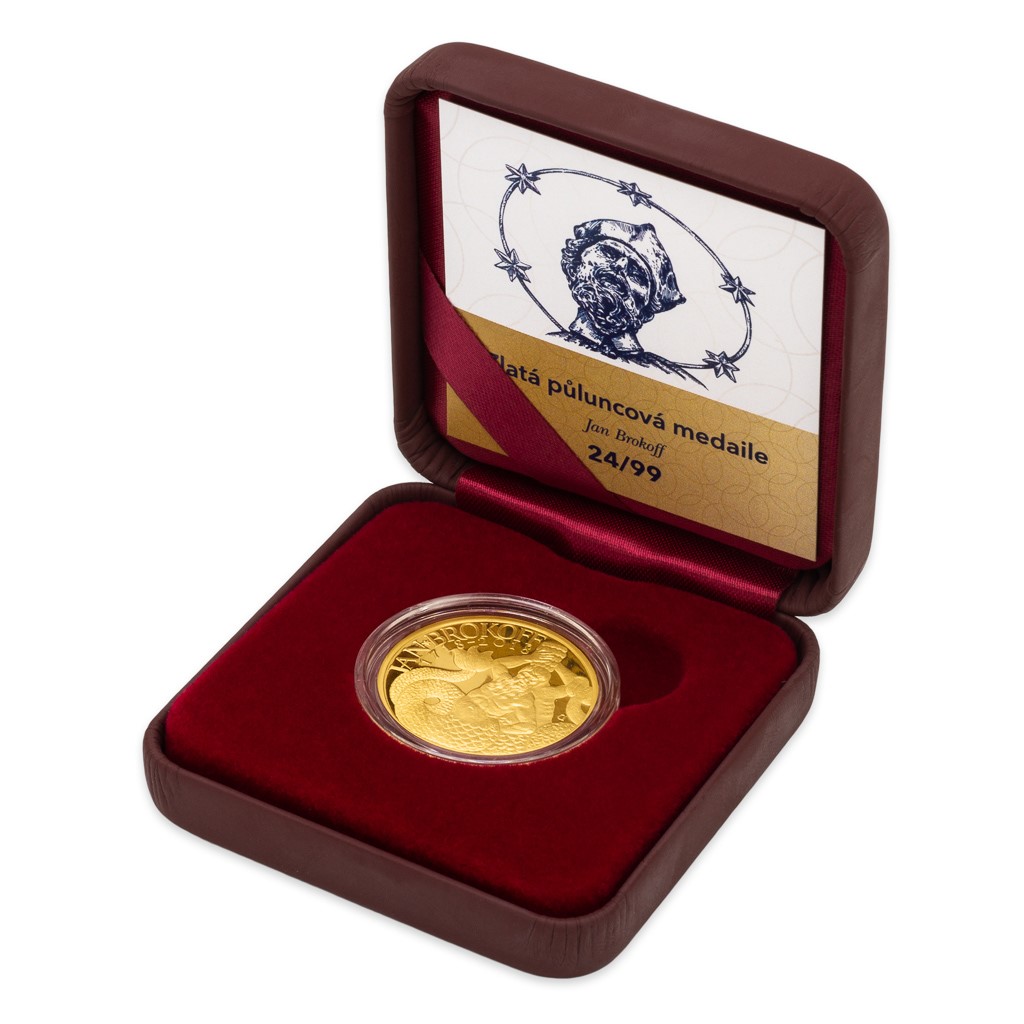 Půluncová zlatá medaile vychází v nákladu pouhých 99 kusů – každý je ručně číslovaný na hraně a doplněný ilustrovaným certifikátem pravosti, který připomíná život a dílo Jana Brokoffa.