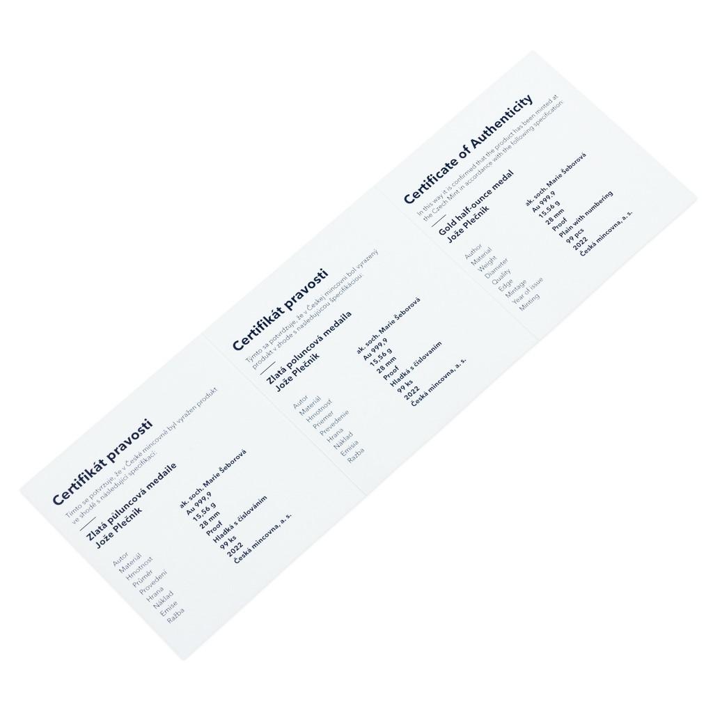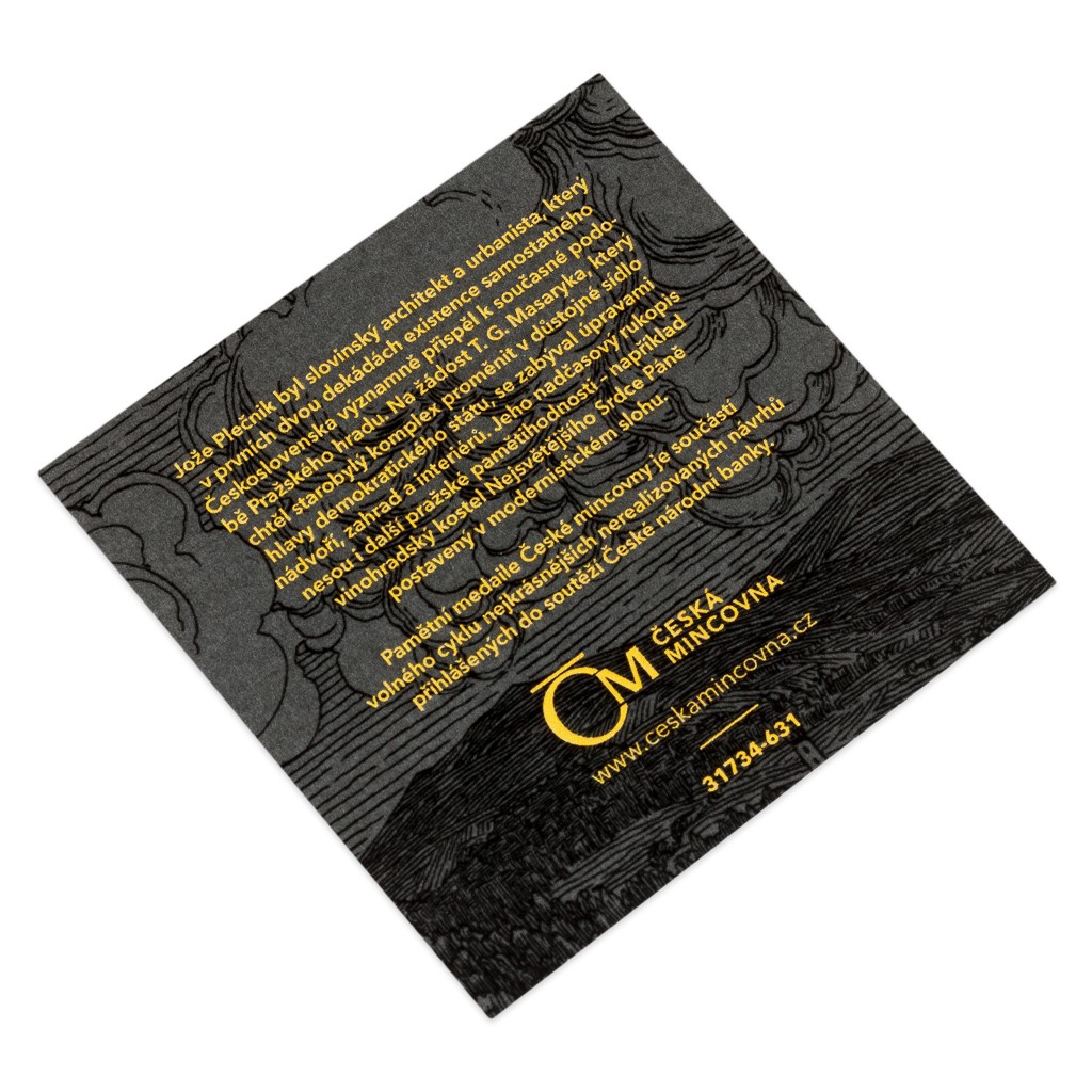 V roce 2022 si připomínáme 150. výročí narození Jože Plečnika, který zanechal nesmazatelnou stopu v československé architektuře. Při této příležitosti vznikla půluncová zlatá medaile České mincovny, která je součástí volného cyklu nejkrásnějších nerealizovaných návrhů přihlášených do soutěží České národní banky.