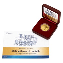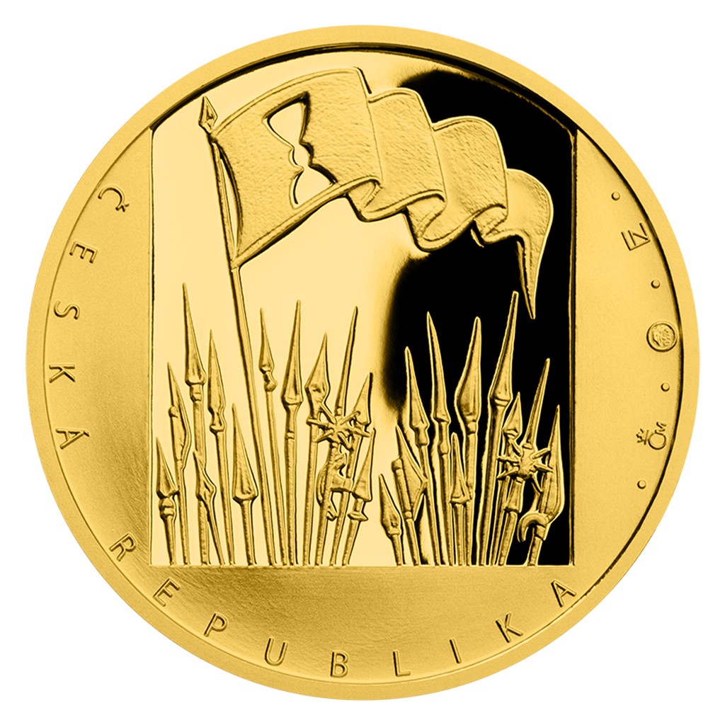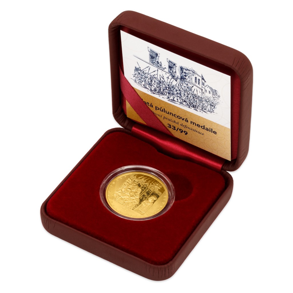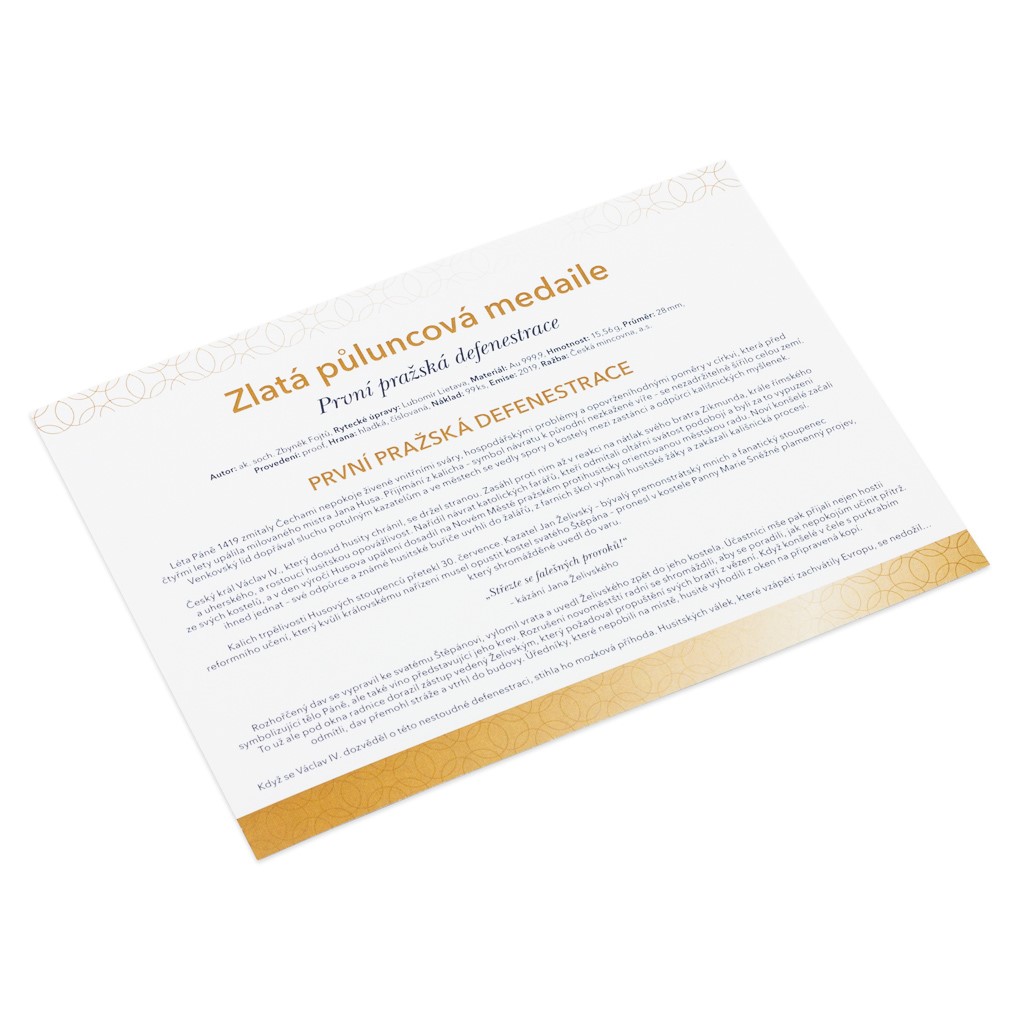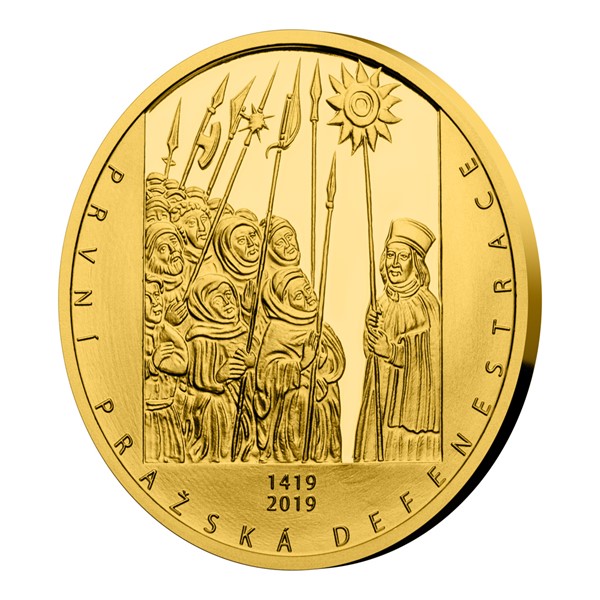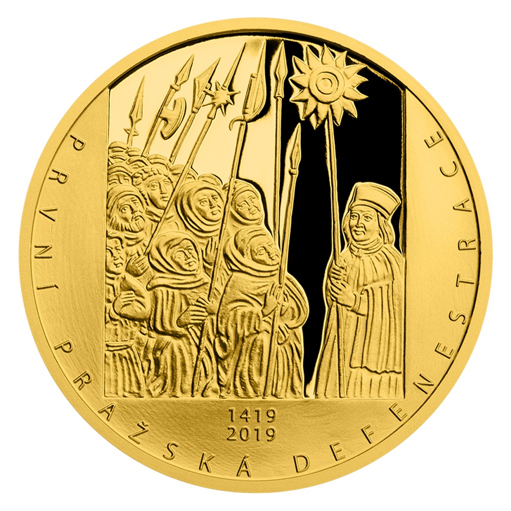 Uplynulo rovných šest století od první pražské defenestrace, která rozpoutala husitské války. Jako připomínka klíčové události českých dějin vychází půluncová zlatá medaile České mincovny, která je součástí volného cyklu nejkrásnějších nerealizovaných návrhů přihlášených do soutěží České národní banky.