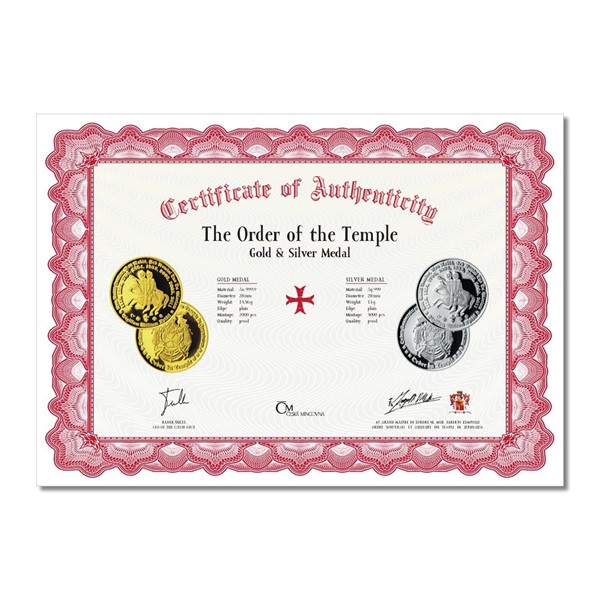 Součástí dodávky je také certifikát autenticity, který je podepsán velmistrem Řádu templářů.