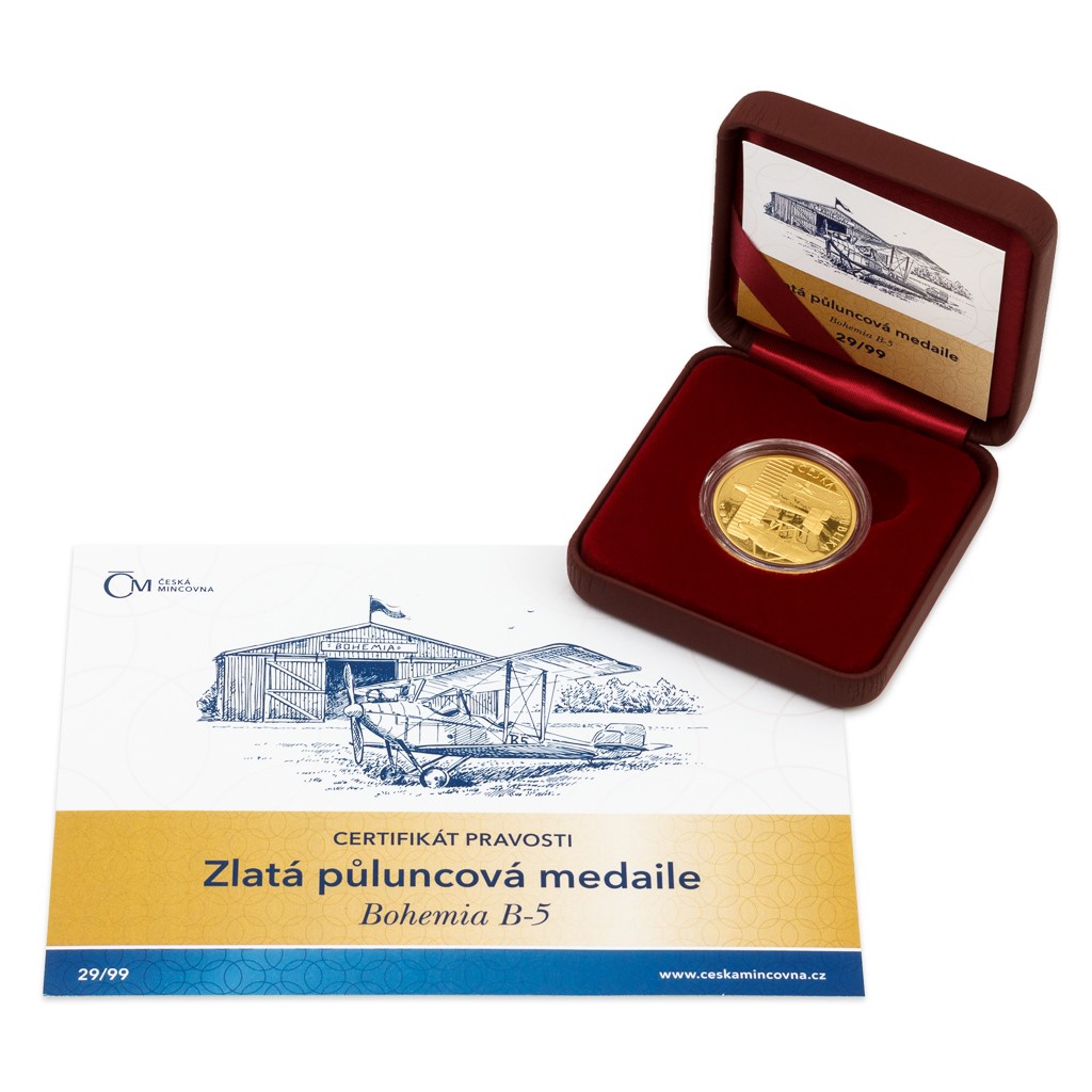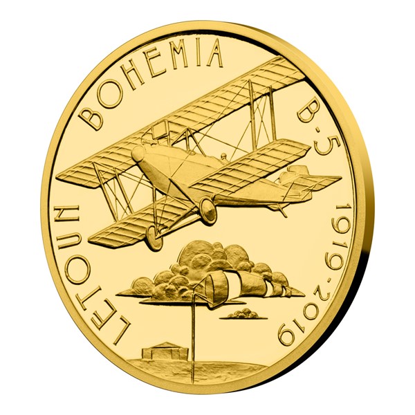 V roce 1919 – před rovnými 100 lety – poprvé vzlétl první letoun československé výroby. Jako vzpomínka na průkopnickou Bohemii B-5 vychází půluncová zlatá medaile České mincovny, která je součástí volného cyklu nejkrásnějších nerealizovaných návrhů přihlášených do soutěží České národní banky.