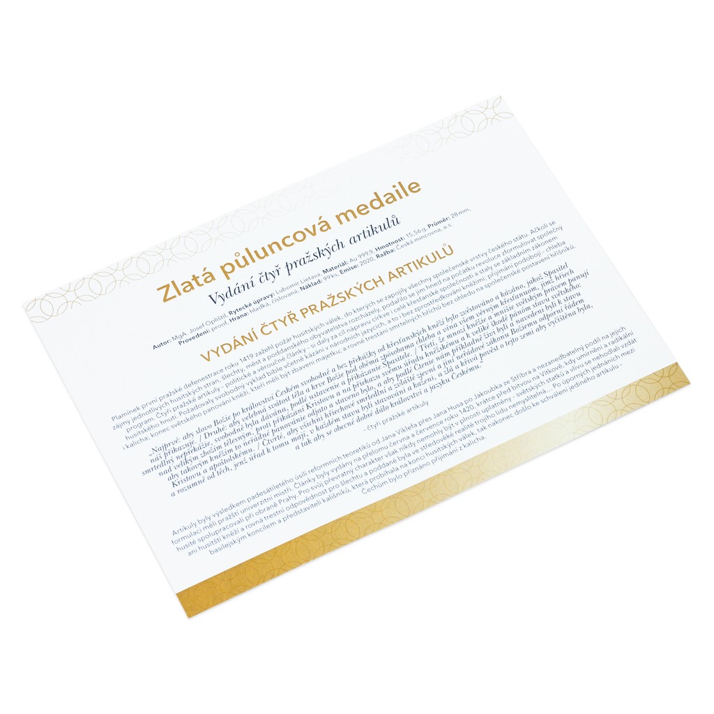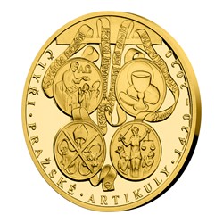 V roce 2020 si připomínáme 600. výročí vydání čtyř pražských artikulů. Při této příležitosti vychází půluncová zlatá medaile České mincovny, která je součástí volného cyklu nejkrásnějších nerealizovaných návrhů přihlášených do soutěží České národní banky.