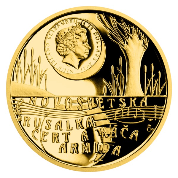 Reverzní strana mince, která je dílem medailérky MgA. Petry Čánské, nese skladatelův portrét z doby jeho největší slávy. Kompozici dotváří jeho autogram a jméno ANTONÍN DVOŘÁK. Averzní strana je pak věnována Dvořákově nejslavnější opeře – Rusalce – a předkládá jezero s vlnkami tvořenými notovou osnovou i názvy slavných děl: NOVOSVĚTSKÁ, RUSALKA, ČERT A KÁČA, ARMIDA. Protože se jedná o minci vydávanou v zahraniční licenci ostrova Niue, nese averz ještě nezbytné atributy tohoto emitenta, které jsou zakomponovány do měsíčního kotouče – jméno a portrét královny Alžběty II., nominální hodnotu 25 DOLLARS a rok emise 2021.