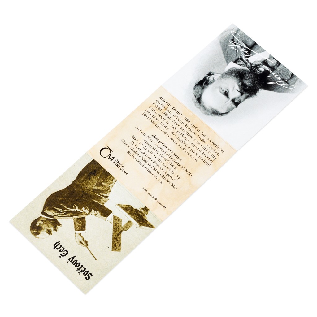 Volný cyklus půluncových zlatých mincí České mincovny, který připomíná významné osobnosti světových dějin, představuje svého prvního Čecha – Antonína Dvořáka. Ten se do dvorany velikánů zařadil v roce, kdy uplynulo 180 let od jeho narození.