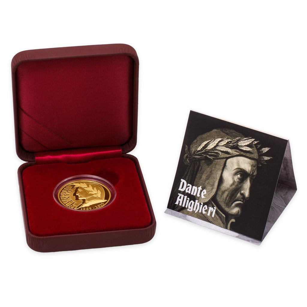 Zlatý poklad od České mincovny uložený ve vínové kožené eutuji doplněné ilustrovaným certifikátem je nádherným uměleckým dílem, jehož autorem je vynikající český medailér Luboš Charvát. Pro reverz zlaté půluncové mince 25 NZD Dante Alighieri ve špičkové kvalitě proof vytvořil věrný portrét básníka spolu s jeho jménem a životopisnými daty. Averz pak patří koláži tvořené atributy emitenta. Krásné zpracování podtrhuje nezpochybnitelnou investiční hodnotu mince, která vkusně obohatí každou numismatickou sbírku. Emisní náklad je pouhých 200 kusů!