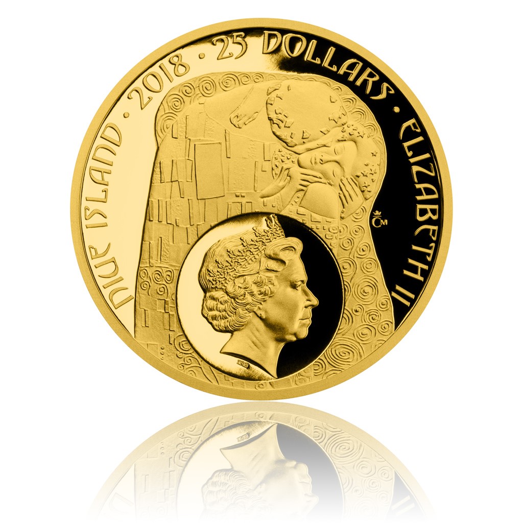 Reverzní strana mince, která je dílem nadané mladé medailérky Ireny Hradecké, DiS., je věnována portrétu zamyšleného umělce – je obklopený avantgardními dekorativními prvky a secesním opisem GUSTAV KLIMT. Averzní straně pak vévodí ústřední výjev z obrazu Polibek. Do něj jsou zakomponovány atributy ostrova Niue, který je emitentem mince. Protože mince České mincovny vycházejí v této zahraniční licenci, nesou portrét a jméno královny Alžběty II., nominální hodnotu 25 DOLLARS (NZD) a rok emise 2018.