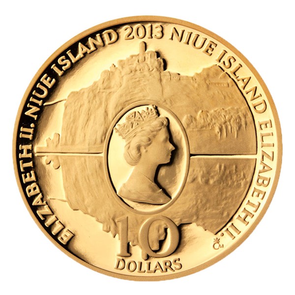 Autor mince – akademický sochař Vladimír Oppl – na averzní stranu mince zakomponoval hrad Střekov, odrážející se ve vodní hladině a povinné prvky mince – nominál 10 dolarů, portrét královny Alžběty, rok vydání 2013 a země Niue Island.