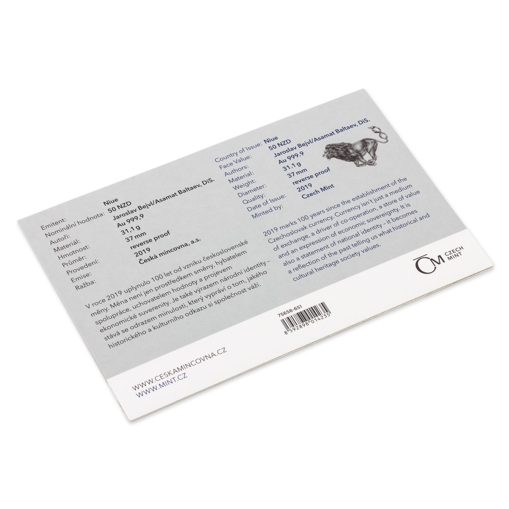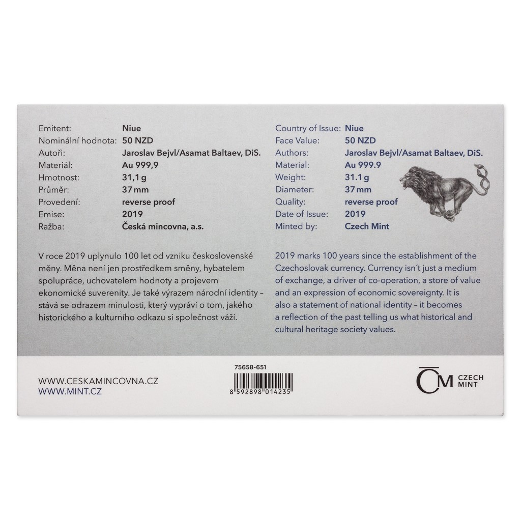 Zlatá uncová investiční mince Český lev 2019 číslo reverse proof
