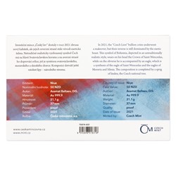 V roce 2021 dostaly všechny varianty investiční mince nový kabátek, ale hlavní myšlenka zůstala zachována. Reverzní straně vévodí český lev v netradičně realistickém podání se Svatováclavskou korunou na hlavě. Averzní strana pak předkládá orlici na štítu, která je syntézou svatováclavského, moravského a slezského dravce. Autorem reliéfu je již tradičně medailér Asamat Baltaev, DiS. Protože mince České mincovny vycházejí v licenci zahraničního emitenta, kterým je ostrov Niue, jejich averzní strana nese jeho nezbytné atributy – jméno a portrét královny Alžběty II., nominální hodnotu 50 DOLLARS (NZD) a rok emise 2021.