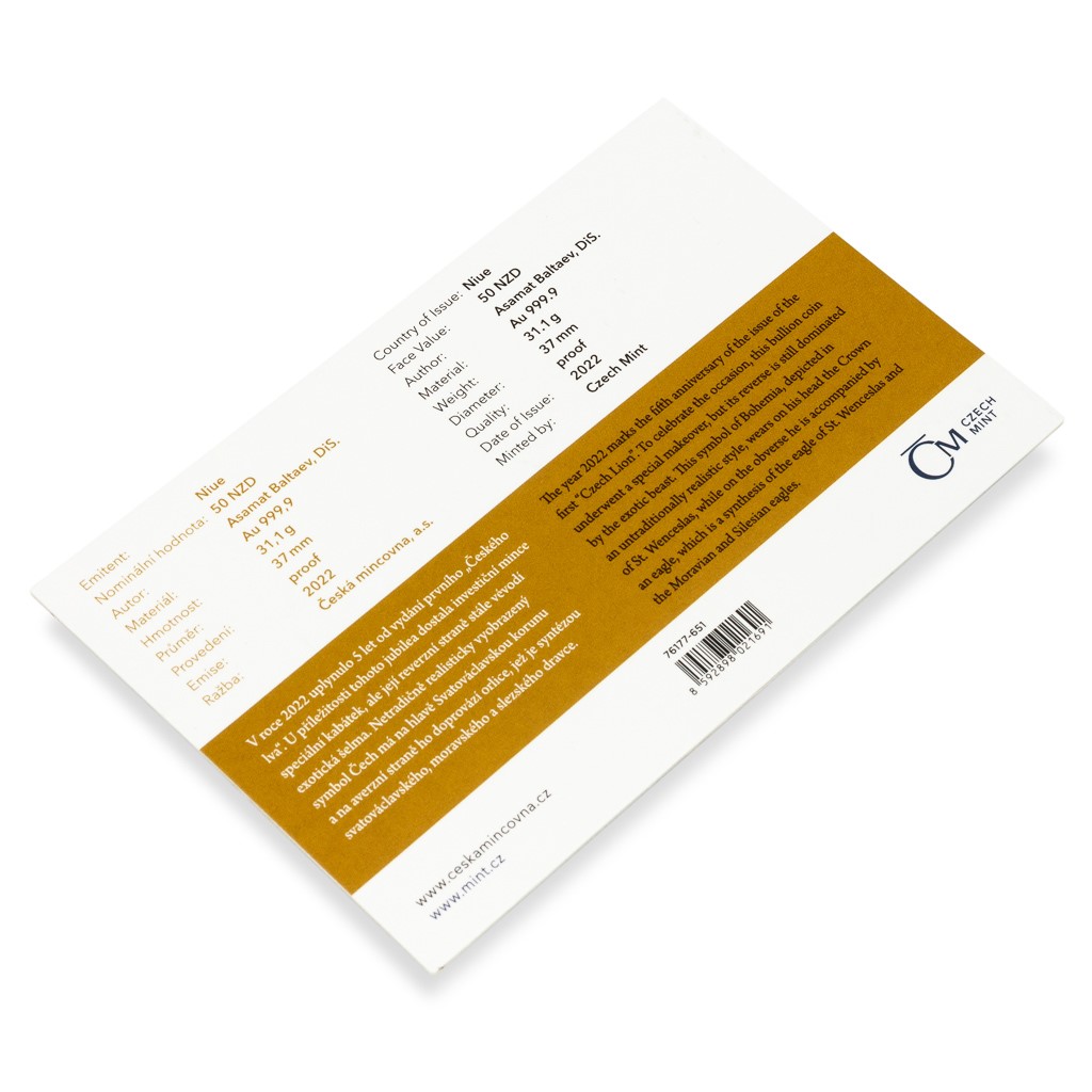 Světové investiční mince bývají věnovány silným národním symbolům a ani „Český lev“, který je první ražbou svého druhu určenou pro český trh, není výjimkou. Hmotnost zlaté mince České mincovny s ročníkem 2022 činí jednu trojskou unci.