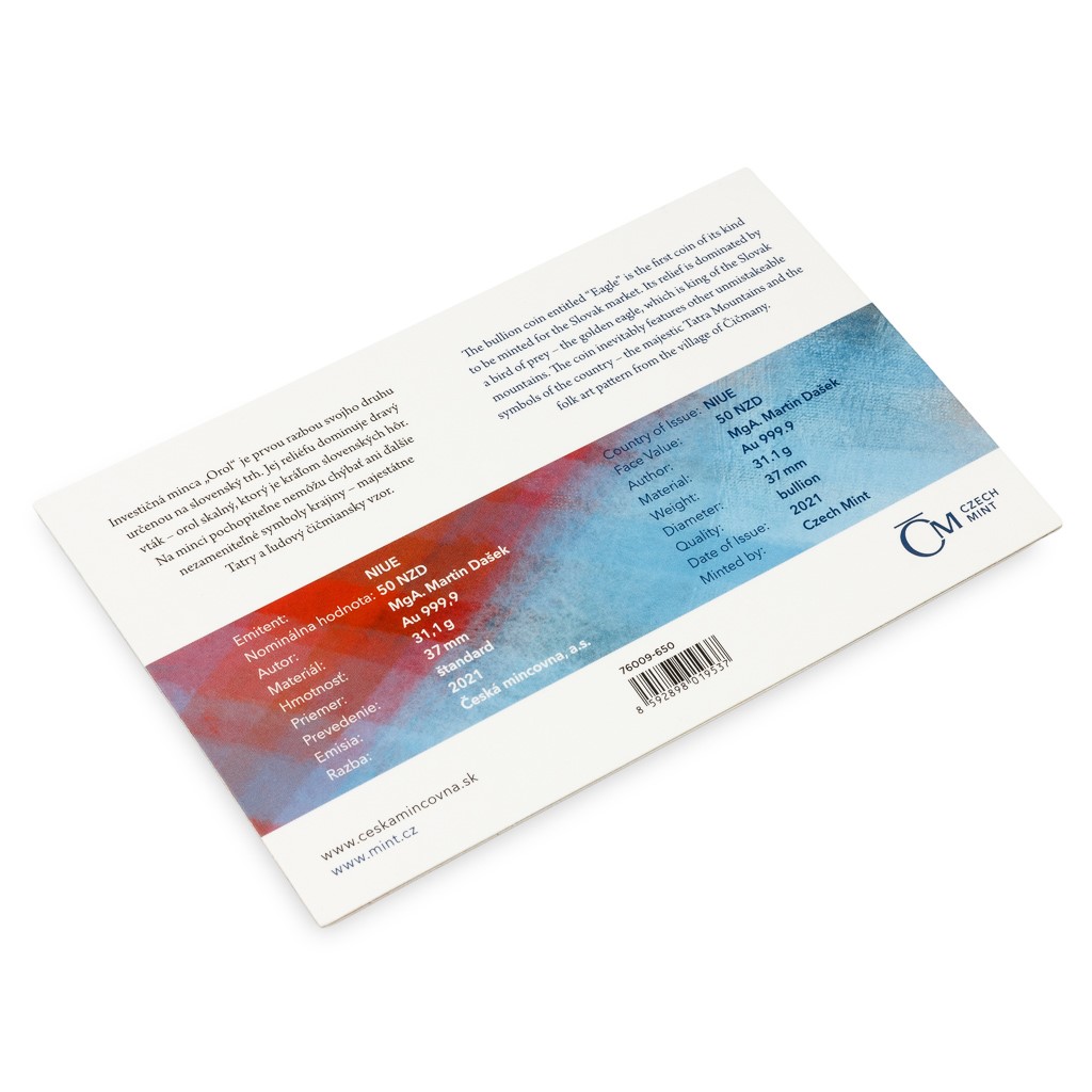 Světové investiční mince bývají věnovány silným národním symbolům a ani „Orol“, který je první ražbou svého druhu určenou pro slovenský trh, není výjimkou. Hmotnost zlaté mince České mincovny činí jednu trojskou unci.