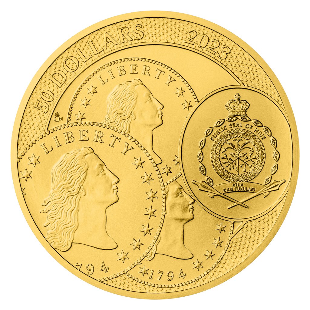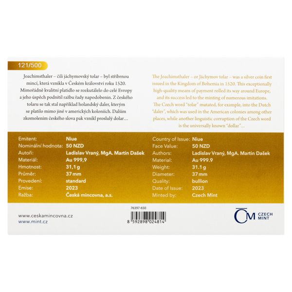 V České mincovně se k odkazu jáchymovských mincmistrů hrdě hlásíme. Je příhodné, že vedle mincí s nominální hodnotou v korunách razíme i dolarové mince – novozélandské, fidžijské či samojské. Po pěti stech letech se tak kruh uzavřel a dolary se vrátily tam, odkud vzešly… Zatímco reverzní strana investiční mince, která je dílem designéra Ladislava Vraného a medailéra MgA. Martina Daška, předkládá tři jáchymovské tolary, na averzu najdete trojici amerických dolarů. Konkrétně se jedná o motiv úplně prvních mincí ražených Spojenými státy v roce 1794, které si od svého českého prapředka vypůjčily nejen jméno, ale také váhu a ryzost použitého kovu. Protože mince České mincovny vycházejí v licenci zahraničního emitenta, kterým je ostrov Niue, jejich averzní strana nese ještě jeho nezbytné atributy – státní znak, nominální hodnotu 50 DOLLARS (NZD) a rok emise 2023.