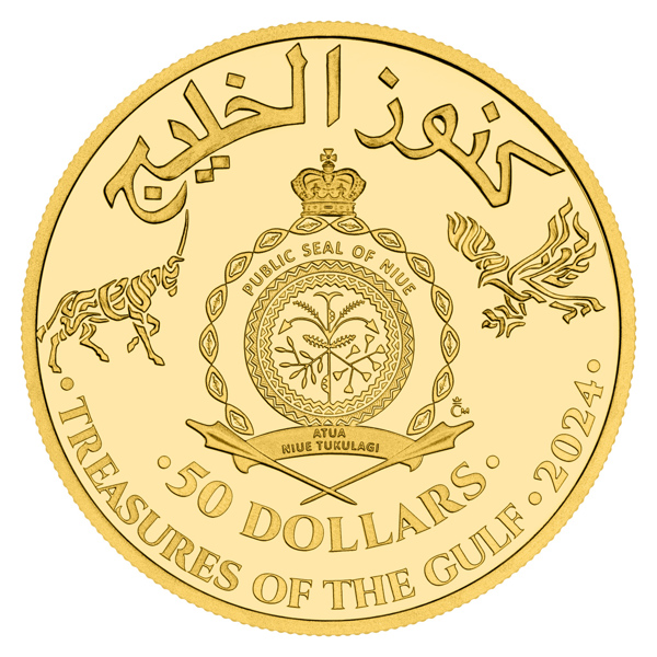 Reverzní strana mince, která je dílem medailéra Asamata Baltaeva, DiS., předkládá dynamické vyobrazení arabského koně. Doplňkovým motivem je muslimský půlměsíc, do kterého je ozdobným arabským písmem zakomponováno slovo ODKAZ. Averzní strana pak nese arabsko-anglický opis POKLADY ZÁLIVU a další dvě typická zvířata Středního východu – sokola a přímorožce. Exotickou kaligrafii vytvořil emirátský umělec Ali Al Ali. Protože mince České mincovny vycházejí v zahraniční licenci ostrova Niue, nesou na averzu ještě jeho státní znak, nominální hodnotu 50 DOLLARS (NZD) a rok emise 2024.