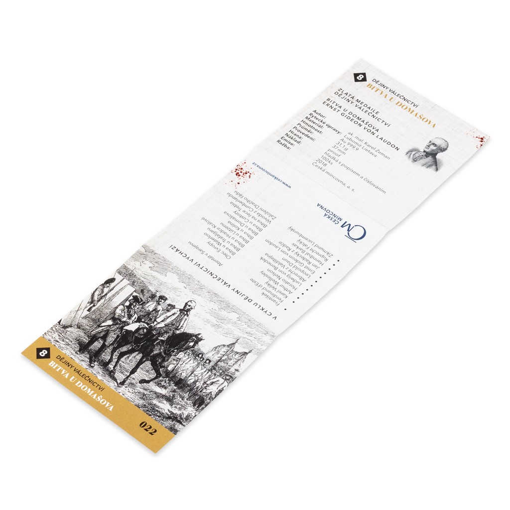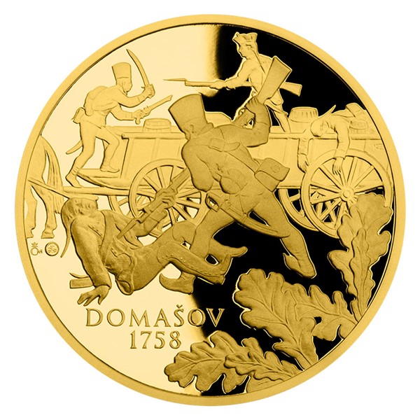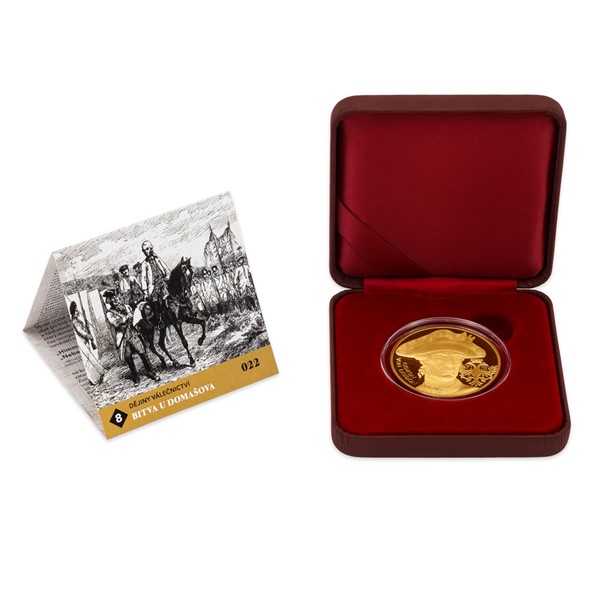 Osmá zlatá medaile z cyklu Dějiny válečnictví přímo navazuje na předchozí emisi akademického malíře Karla Zemana. Připomíná přelomovou bitvu u Domašova.