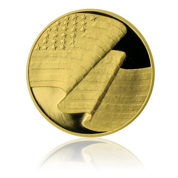 Celou plochu reverzní strany zaujímá kompozice připomínající vlající americkou vlajku.