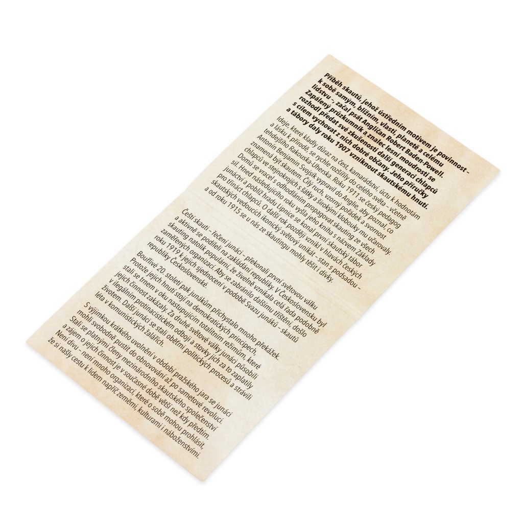 Příběh skautů, jehož ústředním motivem je povinnost – k sobě samým, bližním, vlasti, planetě a celému lidstvu –, začal psát Angličan Robert Baden-Powell. Zapálený průzkumník a znalec lesní moudrosti se rozhodl předat své zkušenosti další generaci chlapců s cílem vychovat z nich dobré občany. Jeho příručky a tábory daly roku 1907 vzniknout skautskému hnutí. Ideje, které kladly důraz na čest, kamarádství, úctu k hodnotám a lásku k přírodě, se rychle rozšířily do celého světa – včetně tehdejšího Rakouska-Uherska. Roku 1911 se český pedagog Antonín Benjamin Svojsík vypravil do Anglie, aby poznal, co znamená být skautem. Čilý ruch, vzorný pořádek a svornost chlapců ve stejnokrojích s šátky a širokými klobouky mu učarovaly. Domů se vracel s odhodláním propagovat skauting ze všech sil. Hned následujícího roku vyšla jeho kniha s názvem Základy junáctví a poblíž hradu Lipnice se konal první skautský tábor pro třináct chlapců – řečených junáků. O další rok později vznikl v hlavách českých skautských vedoucích ikonický světový unikát – stan s podsadou – a od roku 1915 se u nás ze skautingu mohly těšit i dívky. Bouřlivé 20. století pak junákům přichystalo mnoho překážek a strastí, ale v duchu svého hesla „Buď připraven!“ vytrvali. Zájem o jejich činnost je v současné době větší než kdy předtím.