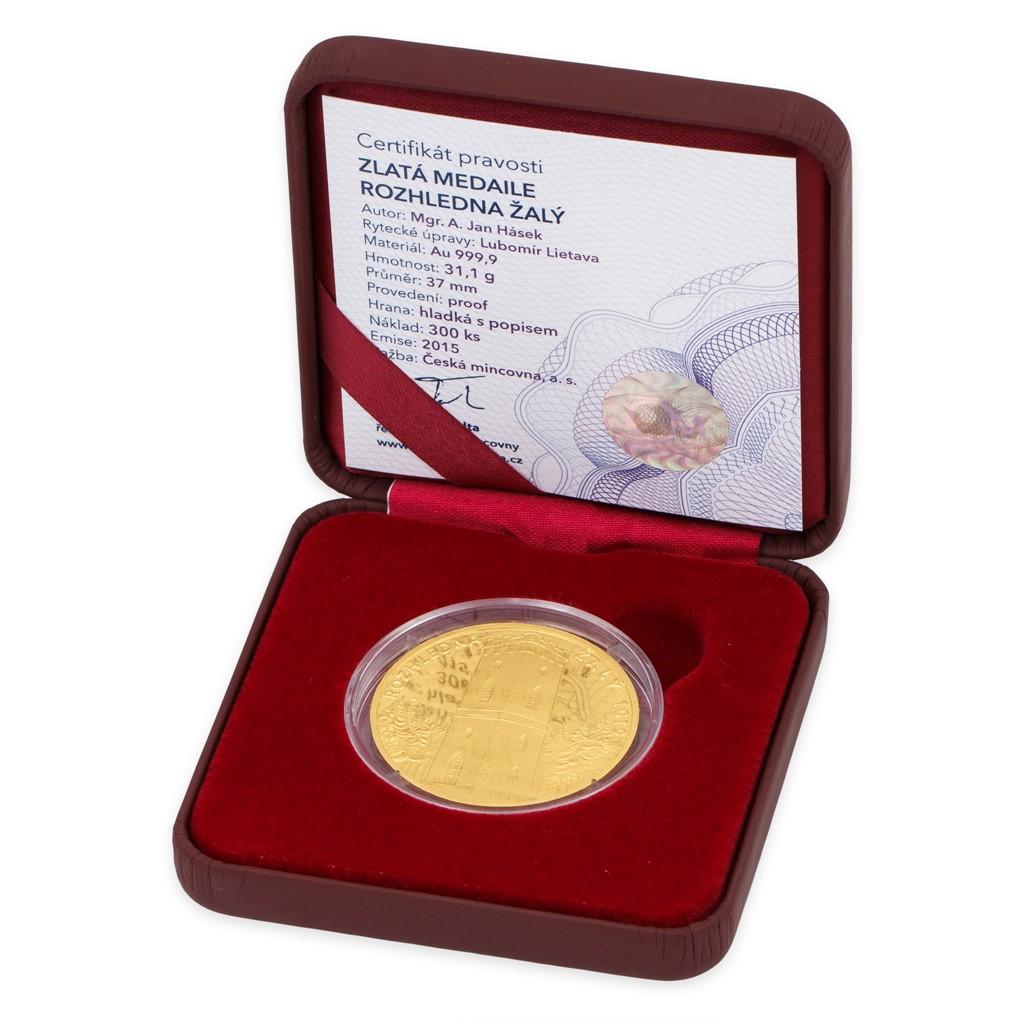 Autorství zlaté uncové medaile Rozhledna Žalý náleží českému medailérovi MgA. Janu Háskovi. Uváženost této volby dokazuje okouzlující zpracování rubové i lícové strany obzvláště vynikající ve špičkové kvalitě proof. Averzu medaile vévodí plastika rozhledny, která je věrnou kopií skutečné předlohy. Reverz nám umožňuje nahlédnout do krajiny v okolí rozhledny. Ke koupi medaile vyzývá jak vysoká umělecká hodnota medaile, tak její lákavý investiční potenciál. Nepromarněte šanci dát svým finančním rezervám nádhernou podobu. Náklad čítá pouhých 300 kusů! Svou drahou sérii můžete uložit do luxusní dřevěné etue.