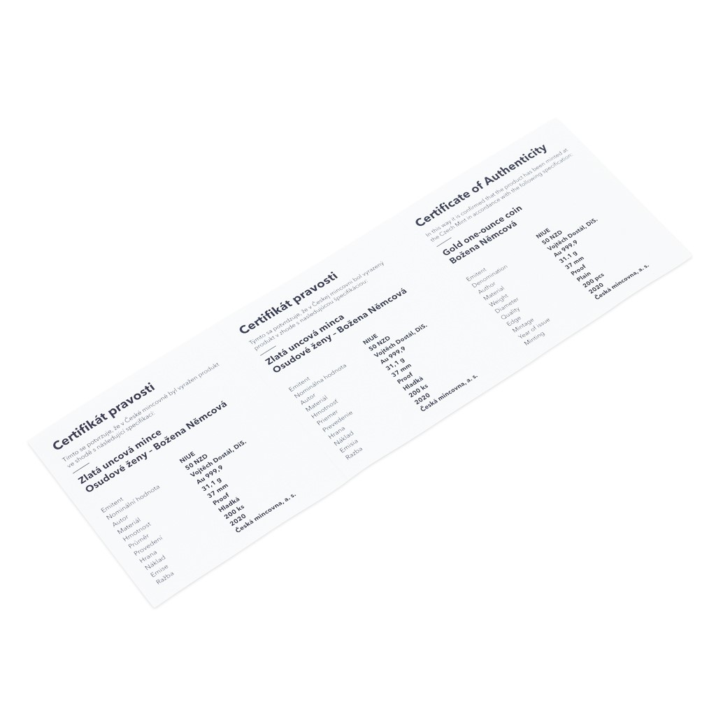 Reverzní stranu mince věnoval medailér Vojtěch Dostál, DiS., mladistvému portrétu půvabné, ale smutné Boženy Němcové. Averzní strana pak patří atributům ostrova Niue, který je poskytovatelem zahraniční licence pro vydávání mincí České mincovny – tedy nominální hodnotě 50 DOLLARS (NZD), jménu a profilu královny Alžběty II. a roku emise 2020.
