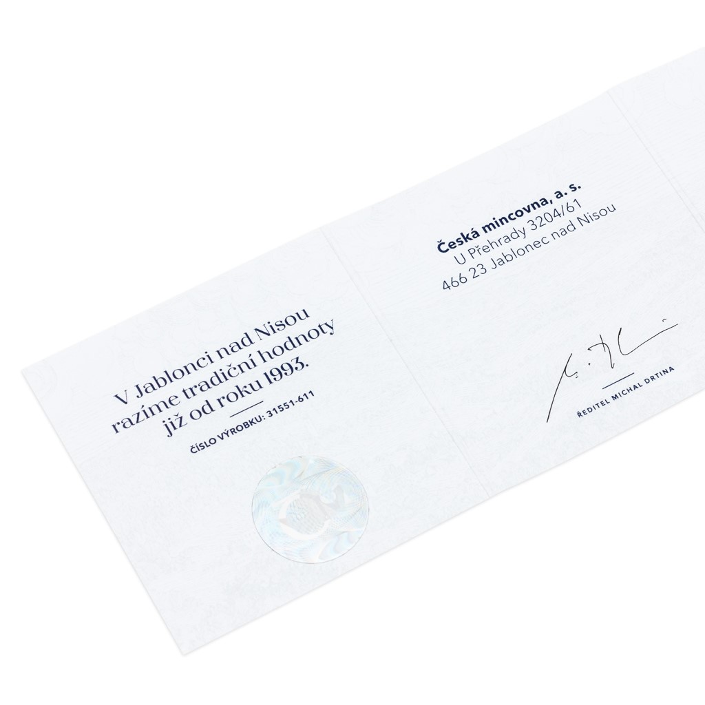Nedílnou součástí každé ražby je unikátní certifikát pokrytý vrstvou ryzího zlata.