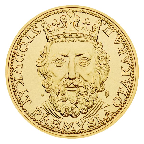 Přemysl Otakar II., řečený král železný a zlatý (* kolem roku 1233 – †26. srpna 1278, Suché Kruty), byl pátým českým králem z rodu Přemyslovců (korunován 1261), druhorozeným synem krále Václava I. a Kunhuty Štaufské. Podle pověsti, jak ji uvádí J. F. Beckovský v knize Poselkyně starých příběhův českých, se Přemysl narodil v Městci Králové. Přemysl Otakar II., vybudoval rozsáhlé panství, které se rozkládalo za Alpy až k Jaderskému moři. Za jeho vlády dosáhlo české království největšího rozmachu až do doby Karla IV. Díky svým diplomatickým schopnostem či sňatkové politice Přemysl Otakar II. získal kromě české koruny titul vévoda rakouský (od roku 1251), vévoda štýrský (od roku 1261) a vévoda korutanský a kraňský (od roku 1269). Tím dosáhl tak významného postavení, že se několikrát ucházel o římskoněmeckou korunu – ovšem právě jeho moc mu tuto výsadu nakonec neumožnila získat. Po jeho závratném vzestupu následoval strmý pád. Na averzní straně je portrét krále s opisem „Stodukát Přemysla Otakara II.“, který je zdoben perlovcem. Na reverzní straně najdeme Přemysla Otakara II. v rytířské zbroji v iluminaci jednoho ze středověkých rukopisů. Doplňuje jej detail ornamentu ze stejné iluminace, pod nímž se v grafické kompozici nacházejí iniciály Přemysla Otakara II. Limitovaná emise 200 kusů, číslovaná na hraně.