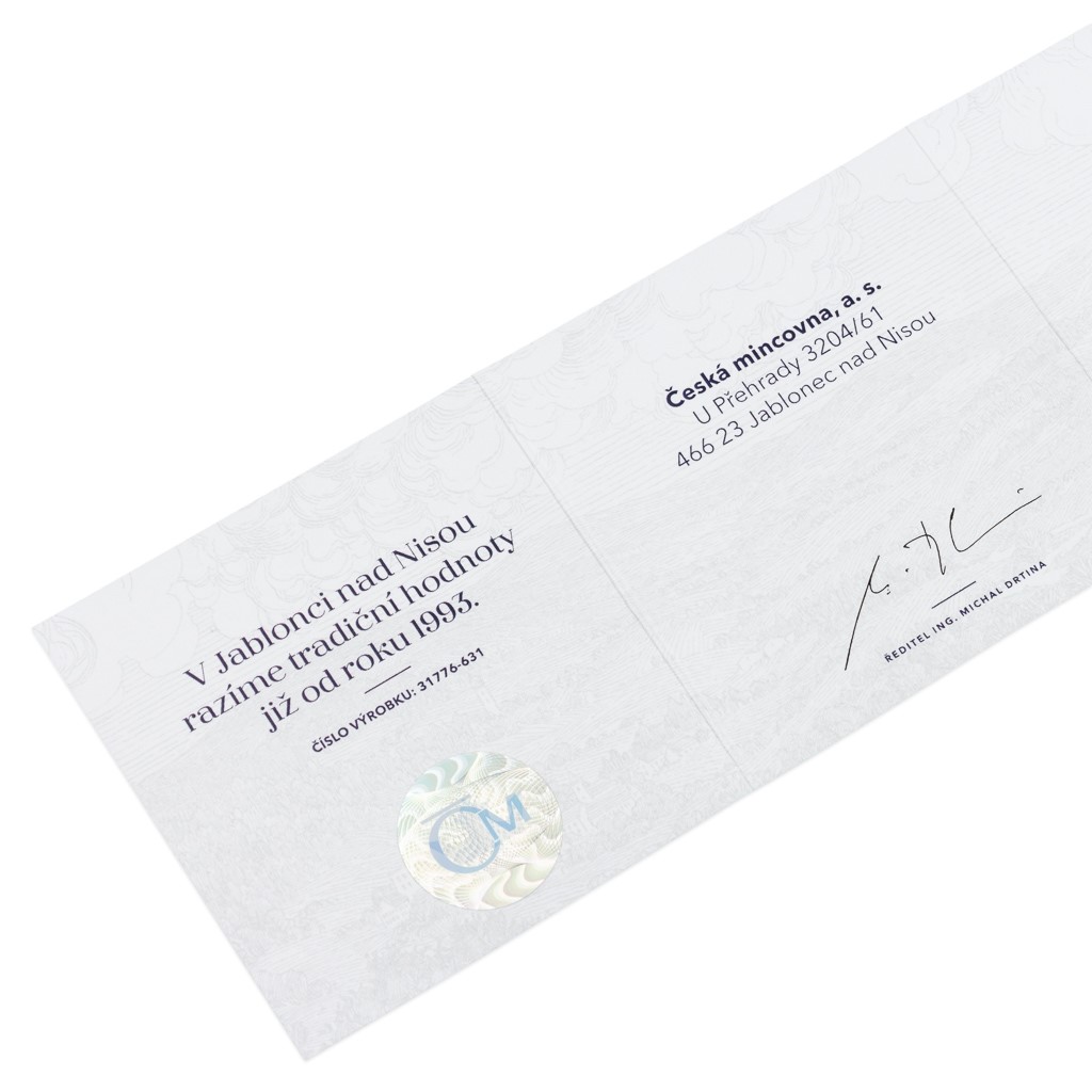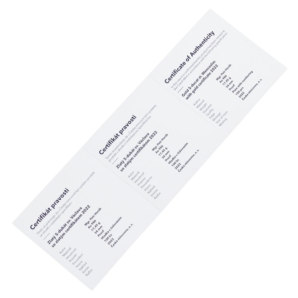 Každý pětidukát je ručně číslovaný na hraně a opatřený unikátním číslovaným certifikátem pokrytým vrstvou ryzího zlata.