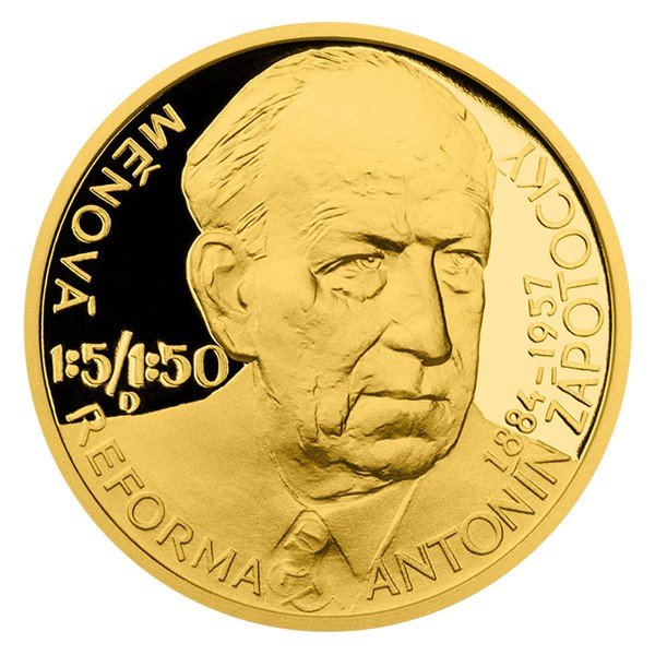 Averz zlaté medaile s dukátovou váhou věnoval akademický sochař Jiří Dostál věrnému portrétu našeho třetího poválečného prezidenta. V opisu je uvedeno státníkovo jméno ANTONÍN ZÁPOTOCKÝ spolu s životopisnými daty 1884–1957. Rovněž je zde zaznamenán i jeho nejzásadnější čin, a to MĚNOVÁ REFORMA spolu s poměrem znehodnocení úspor 1:5/1:50. Averz nese u okraje Zápotockého funkci PREZIDENT ČESKOSLOVENSKÉ REPUBLIKY, léta 1953 a 1957 značící období, kdy byl v čele státu, a vkusně se překrývající symboly, jimiž jsou Malý znak republiky Československé, obrys hranic tehdejšího Československa a pěticípá hvězda ukazující směrem na východ. Na měnovou reformu odkazuje také vyobrazení jednohaléřové mince z roku 1953.
