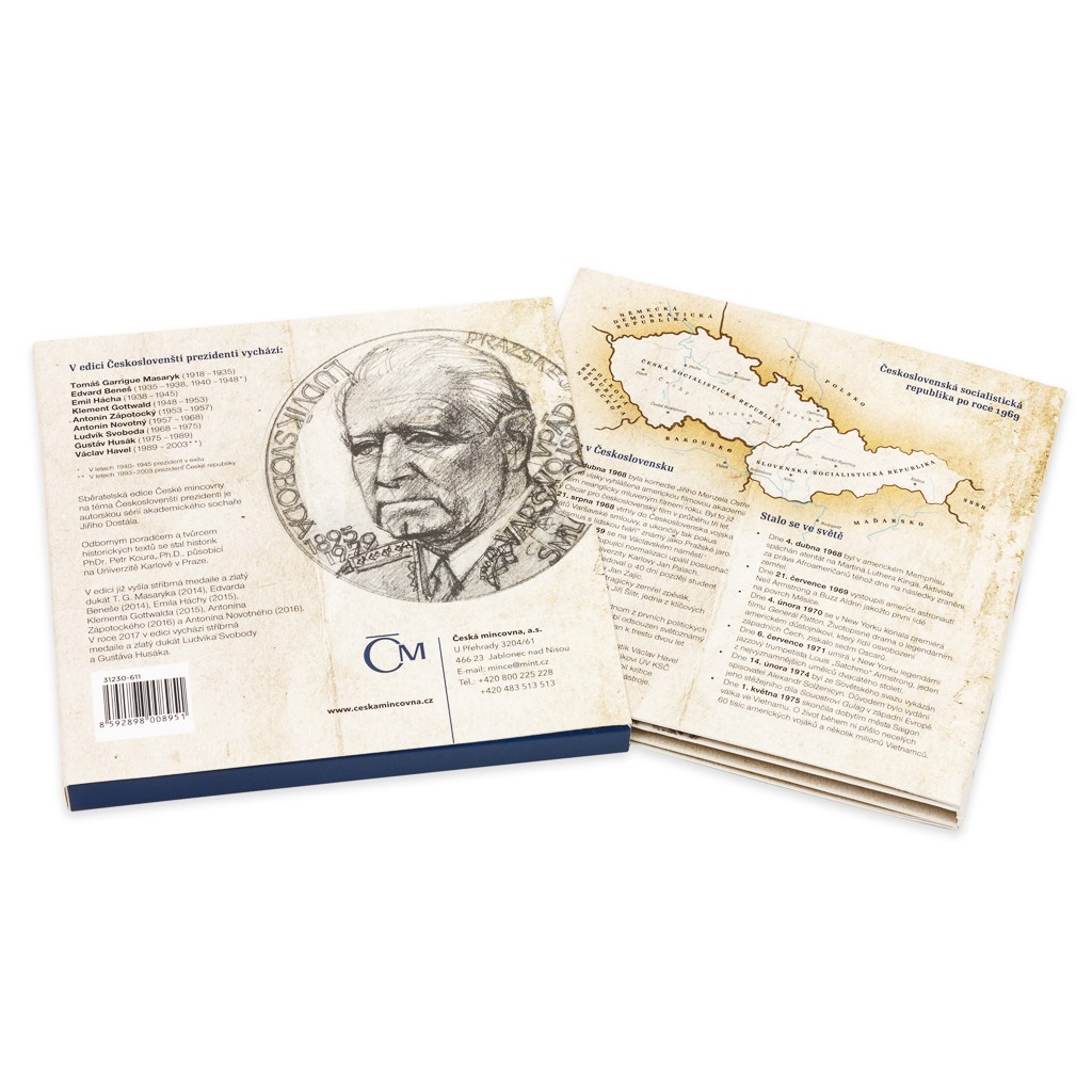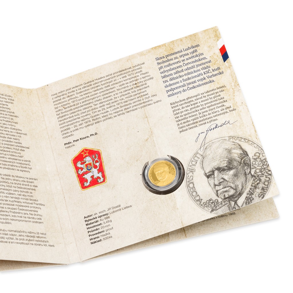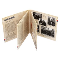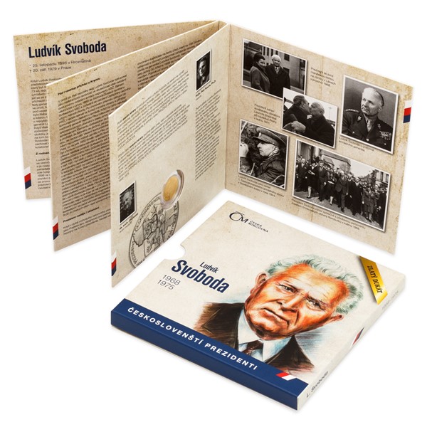 Zlatý dukát je uložen do balení v podobě knížky s kresbami, fotografiemi a odborným textem předního historika PhDr. Petra Koury, Ph.D., který vám přiblíží osudy Ludvíka Svobody. Pro numismatiky-patrioty je připraven také úložný box pro devět tematických blistrů, které stylově a bezpečně uloží exkluzivní ražby této oblíbené sady.