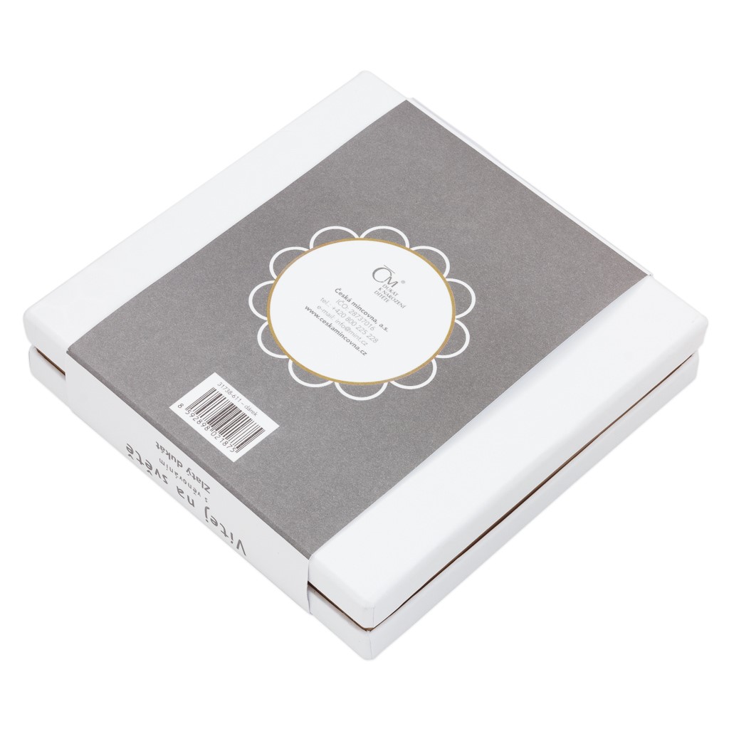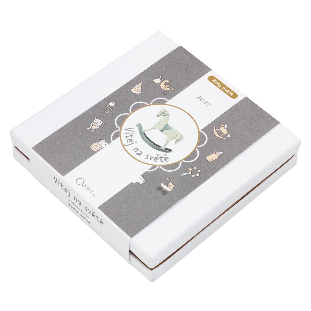 Emise je uložena do elegantního dárkového balení, které rovněž můžete přizpůsobit svým představám. Vedle dukátu totiž obsahuje také certifikát pravosti s prostorem pro vepsání osobního věnování a údajů o miminku.