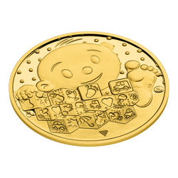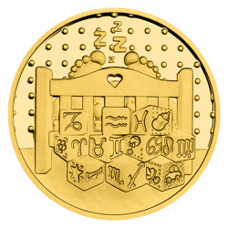 Medailér Petr Patka, DiS., věnoval averzní stranu zlatého dukátu roztomilému miminku, které si hraje s kostkami. Hra ho natolik unavila, že na reverzní straně už spokojeně spí.