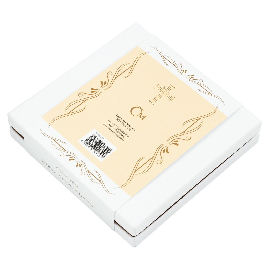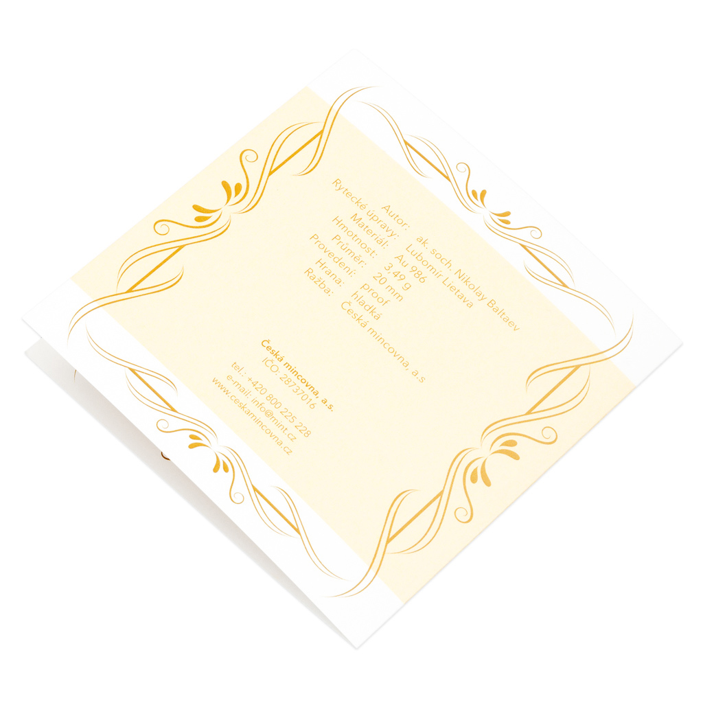 Averzní strana zlatého dukátu patří symbolickému vyobrazení aktu křtu – hrdá matka drží své dítě oblečené do sváteční košilky a duchovní mu uděluje křest. Autorem výtvarné podoby averzu je význačný rytec Nikolay Baltaev (možná znáte jeho syna Asamata, talentovaného medailéra, který se proslavil řadou realizací pro Českou mincovnu i Českou národní banku). Reverzní strana dukátu pak vedle ozdobného motivu předkládá prostor pro vaši fantazii – vyryjeme na ni text dle vašeho přání, například jméno pokřtěného a datum křtu či osobní věnování.
