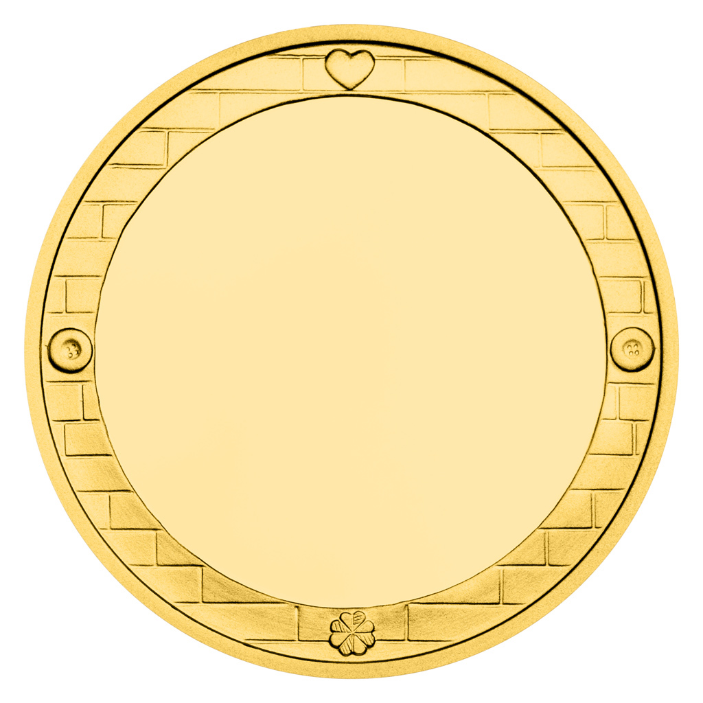 Medailérka Eva Prousková, DiS., věnovala averzní stranu dukátu malému kominíčkovi, který má u sebe všechno potřebné, aby mohl vyčistit komín. Reverzní strana pak předkládá prázdný prostor pro vyrytí textu obklopený srdíčkem, čtyřlístkem a dvěma knoflíky.