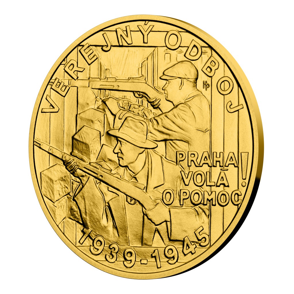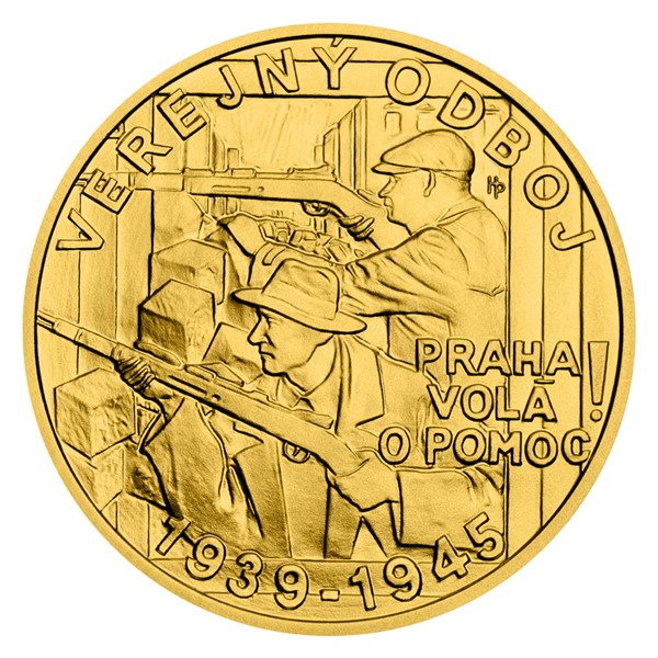 Květnovému povstání věnoval Mgr. Petr Horák averzní stranu dukátu. Výjev doplněný nápisem PRAHA VOLÁ O POMOC! předkládá dva obyčejné Čechy v civilním oblečení, kteří s puškami v rukou hájí barikádu poskládanou z dlažebních kostek. V opisu je uvedeno VEŘEJNÝ ODBOJ 1939–1945. Reverzní strana ražby, která je dílem akademického sochaře Jana Lukáše, pak předkládá mapu protektorátu zastíněnou křídly nacistické orlice. Kompozici reverzu dotvářejí letopočty 1939 a 1945 a nápis PROTEKTORÁT ČECHY A MORAVA v češtině a němčině.
