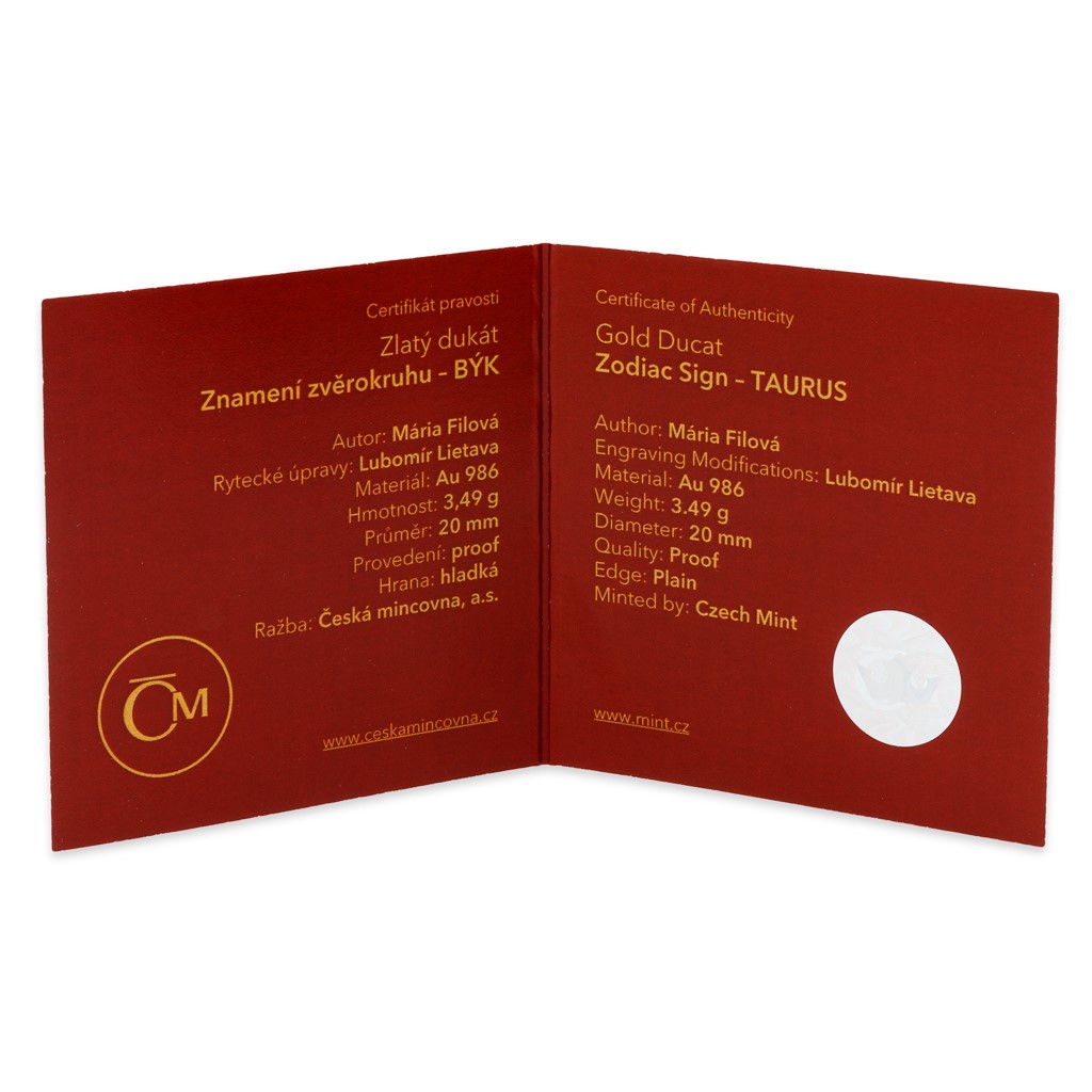 Pamětní dukát, jehož výtvarná podoba osloví cit pro krásu každého býka, připravila talentovaná medailérka Mária Filová. Na averzní straně se nachází dynamické vyobrazení znamení obklopené českým a latinským textem BÝK – TAURUS a také příslušnými astrologickými značkami. Reverzu dukátu vévodí všech 12 znamení zvěrokruhu, slunce a měsíc.