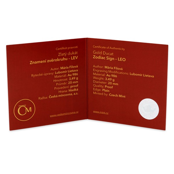 Averzní straně dukátu, jehož autorkou je nadaná umělkyně Mária Filová, vévodí dynamické vyobrazení krále zvířat obklopené česko-latinským opisem LEV – LEO a jeho astrologickými značkami. Reverzní strana je společná celé zvířetníkové sérii a nese symboly všech 12 znamení, měsíce a také slunce, které je vládnoucím nebeským tělesem lvů v lidské podobě.