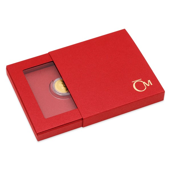 Dukát je uložen do praktické krabičky, která zároveň slouží jako rámeček pro jeho vystavení.