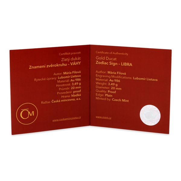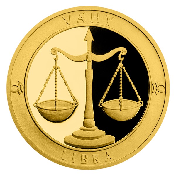 Jistě proto ocení dárek v podobě zlatého dukátu nadané výtvarnice Márie Filové. Averzu dominuje vyobrazení vah se zavěšenými miskami obklopené česko-latinským opisem VÁHY – LIBRA a patřičnými astrologickými symboly. Reverz je společný celé sérii a nese slunce, měsíc a značky všech 12 zvířetníkových znamení.