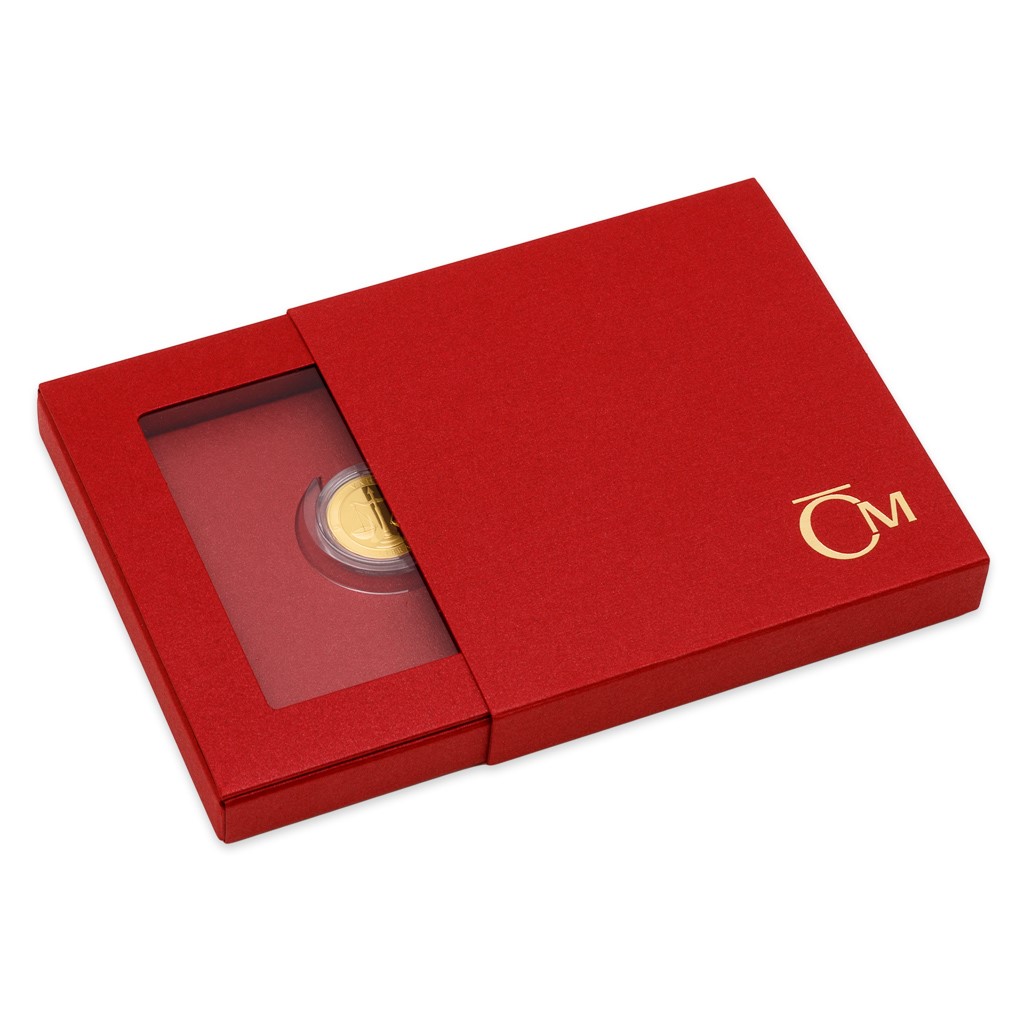 Dukát je uložen do speciální krabičky, která slouží také jako rámeček pro jeho vystavení.