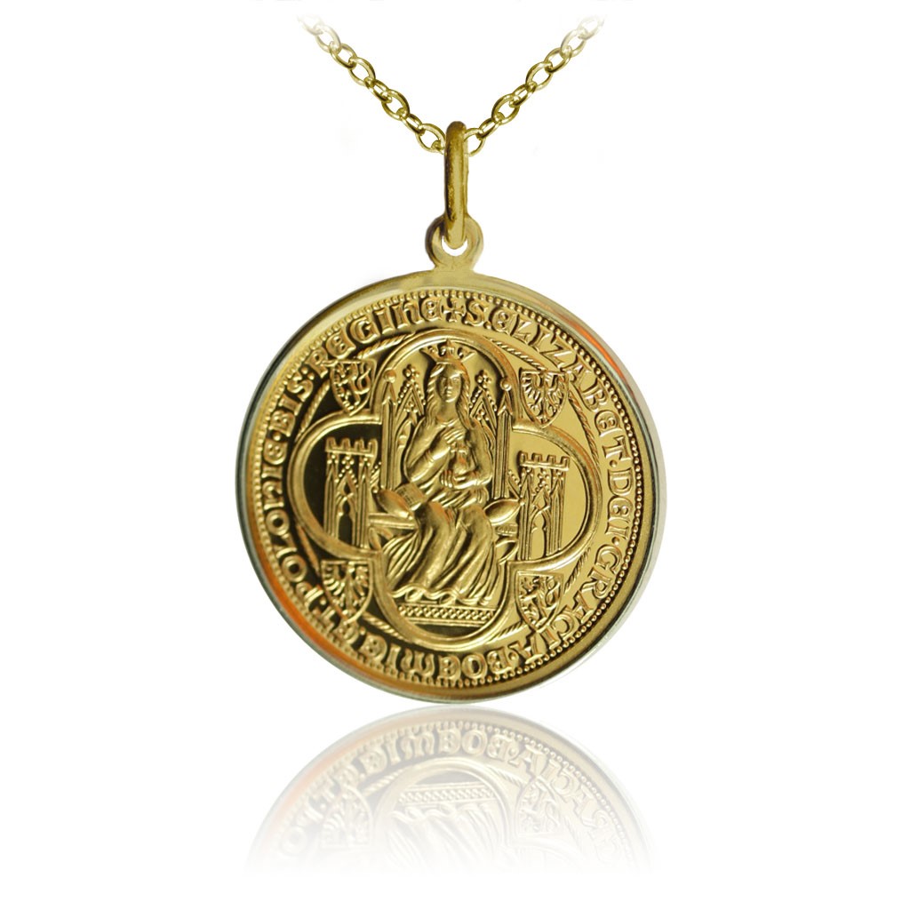 Eliška/Alžběta Rejčka, původním jménem Richenza (Rixa) Piastovna, Ryksa Elżbieta (1. září 1288 Poznaň – 18. října 1335 Staré Brno) byla česká a polská královna, druhá manželka Václava II. i Rudolfa Habsburského. Jako jediná žena v české historii se stala královnou nejen dvakrát, ale po boku dvou mužů. Na averzní straně mince je zobrazena královna Eliška Rejčka. Reverzní strana nese pečeť královny Elišky – vdovy. Je zde vyobrazená na trůnu společně s erby, v opise s latinským textem: Eliška z boží vůle královna česká a polská. Ve stylizovaném gotickém rámci sedí Eliška Rejčka na trůnu připomínajícím její věnná města. V rozích jsou umístěny úhlopříčně na gotických pavézách dva čeští lvi a pravděpodobně dvě polské orlice. Medailonek je zavěšen na zlatém řetízku 45 cm, typ Anker/Au 585.