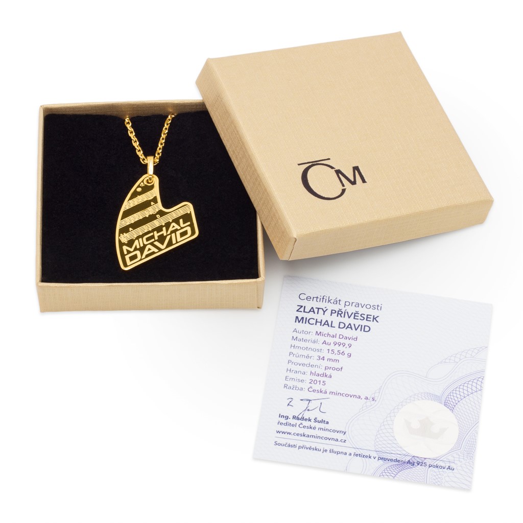 Jeho vystoupení jsou pravidelně vyprodaná a představují skutečný požitek pro všechny fanynky a fanoušky, k čemuž přispívá i nesmírný temperament Michala Davida. Další z koncertů je plánován na 19. června v Praze při příležitosti zpěvákových krásných 55. narozenin. Nový zlatý přívěsek je tak půvabným dárkem od České mincovny nejen pro samotného Michala Davida, ale i pro jeho věrné obdivovatele. Přívěsek ve tvaru klavíru z ryzího zlata je z jedné strany ozdoben klaviaturou a umělcovým podpisem. Druhá strana nese notový zápis a nápis MICHAL DAVID. Součástí je také pozlacený řetízek ze stříbra. Rezervujte si exkluzivní šperk, nad nímž zaplesá srdce každého hudebního fajnšmekra!